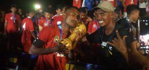 Ekspresi kapten Perse Ende Adi Aba bersama tropi bergilir ETMC