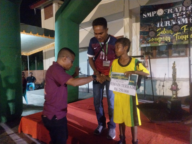Turubius Keruwen kemudian bikin hattrick melalui tendangan bebas. SDN Ona semakin tidak terkendali. Pemain bernomor 7 itu mencatatkan diri di papan skor dengan gol yang keempat, membuat SDN Ona unggul 7-0.